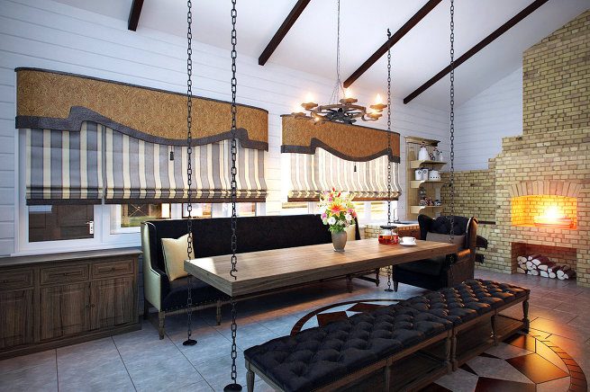 Большой обеденный стол, в подвешенном состоянии хорошо вписывается в интерьер, выполненный в стиле «кантри». Для удобства он прикреплен цепями сразу к полу и потолку, что позволяет ему оставаться на месте, а не раскачиваться из стороны в сторону. Поэтому пользоваться таким столом вполне комфортно.