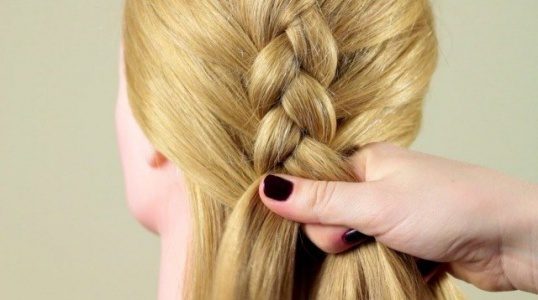 Начинают создавать прическу также с центральной лобовой части роста волос. Если нет челки, то можно начать с пряди, растущей на виске. Плетение, применимое здесь, называется «обратным». В отличие от обычного, боковые пряди кладутся не на, а под центральную.