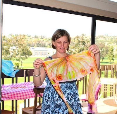 Шарф закрепляется на клеенку и наносится рисунок маркером, после с помощью пипетки по рисунку наносится спирт, маркер растекается и получается замысловатый рисунок. После изделие высушивается.