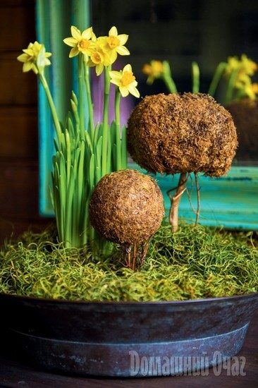 Расставьте деревца и горшочки с цветами в кашпо и укройте всю композицию зеленым мхом.