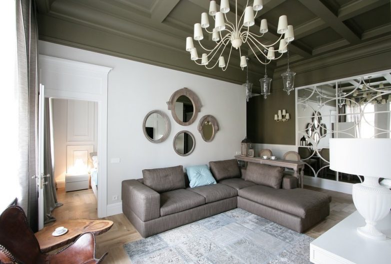 Все зеркала имеют радиальные узоры или форму, что контрастно смотрится на фоне доминирующих прямоугольных форм. Также несомненным элементом домашнего уюта является ниша под свечи – компактный псевдокамин.