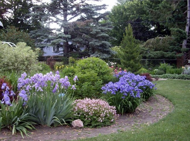 Ирисы – прекрасная идея для моноцветника. Хорошо бы оформить его по краям натуральным камнем или отсыпкой из гравия и в дополнение к ирисам посадить декоративные злаки.