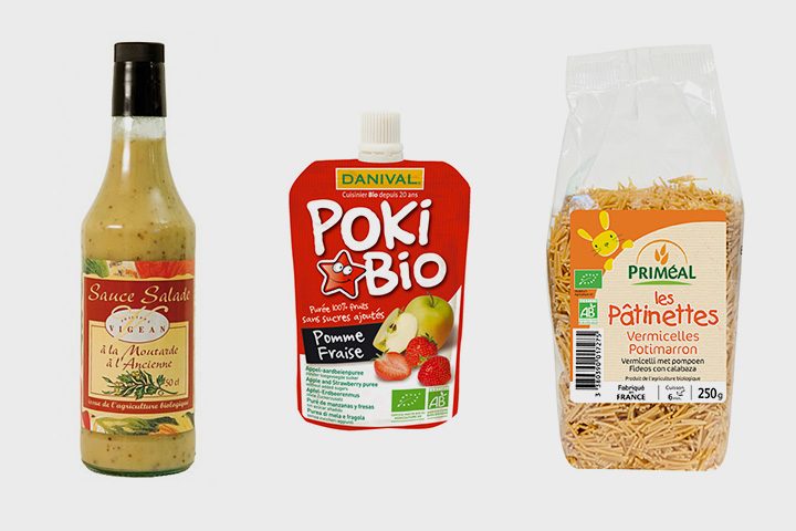 Соус для салата биойогуртовый с зеленым луком Philippe Vigean (650,5 р.), клубничный десерт Danival (128 р.), биовермишель с тыквой для детей Priméal (262 р.)