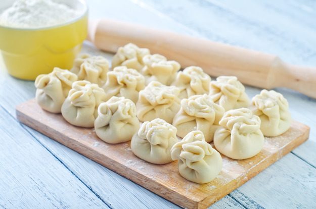 От того, как замешано тесто, зависит готовый результат. Оно должно быть эластичным, мягким и не рваться. Его готовят в несколько этапов с перерывами. В промежутках между замешиванием можно заниматься приготовлением фарша.