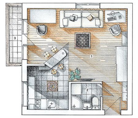 Или, как вариант кухню расположить в гостиной за счет коридора. А отделить кухонные принадлежности от всего остального можно с помощью стеклянных перегородок. Если вы поставите цветное стекло, то в солнечные дни оно будет радовать ваш взгляд и придавать гостиной праздничное настроение.
