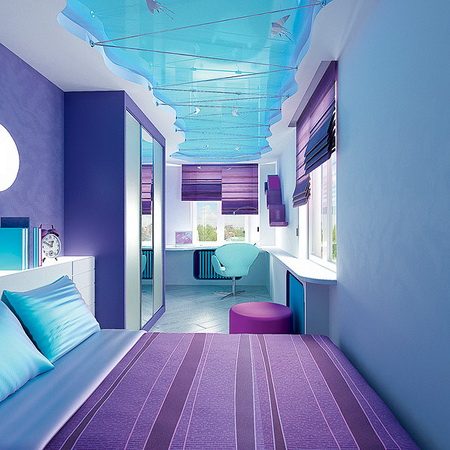 На полу для глаза будет лучше плитка, а не обыкновенный линолеум. Также важно, чтобы потолок гармонировал со всем другим интерьером. Тут можно применить молдинг, краски двух тонов, и сделать тоже самое в гостиной. Вдоль большой стены можно установить шкаф-купе, выполненный из стекла, который зрительно увеличивает объем комнаты.