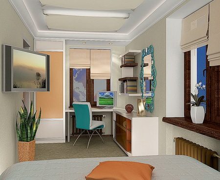 Другой способ перепланировки и изменения дизайна хрущевки – увеличение спальни за счет рабочего кабинета. Для этого вы также разбираете между ними стену и закладываете одну из дверей. Получается просторное место с двумя окнами. Можно также между ними поставить раздвижные стенки. Подобное возможно когда в квартире проживают два или один человек.