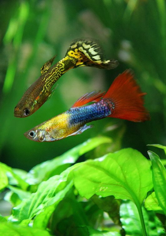 Гуппи — самые нетребовательные рыбки. Самки гуппи крупнее своих «супругов», невзрачные, серого «рыбьего» цвета. Самцы отличаются разнообразием окраски, яркими хвостовыми вуалеобразными плавниками. Будучи живородящими, гуппи легко размножаются: самки мечут вполне сформировавшихся мальков, способных сразу же питаться мелким планктоном и измельченным сухим кормом. Но можно обойтись и вовсе без самок, а завести сразу десяток самцов (аквариум минимум на 20 л), которые в исключительно мужской компании будут ярче, крупнее и проживут очень долго.