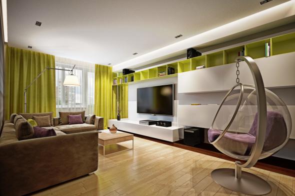 Не забыли дизайнеры и о цветовых акцентах. Они старались сделать их в каждом помещении: на кухне, в гостиной и спальне. Зеленый цвет есть почти во всех помещениях, кроме ванны и санузла. При оформлении интерьера было использовано много натуральных цветов: бежевый, серый и молочно-белый.