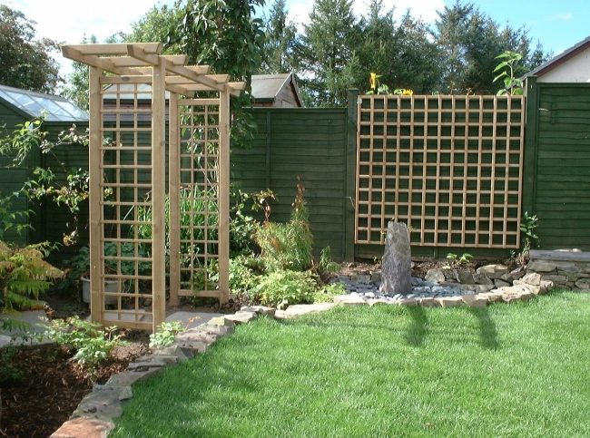 К забору можно «пристроить» беседки, перголы, сиденья, красивые тематические уголки или цветники.