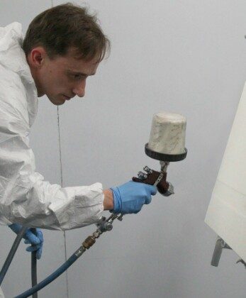 Для покраски используется покрасочный пистолет, с помощью которого краска из емкости под давлением распределяется по поверхности тонким равномерным слоем. Ни кистью, ни валиком такого эффекта не добиться!