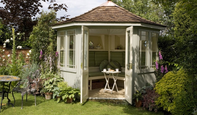 Стилизуйте ваш садовый павильон под «сказочный домик», избушку с крышей из тростника, охотничий домик или маленькую «виллу».