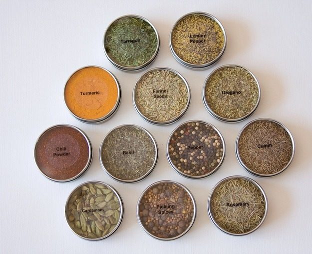 Это очень простое и крайне удобное приспособление. На дно маленьких круглых банок приклеен магнит, благодаря чему порции этих специй всегда можно держать под рукой, например на холодильнике.