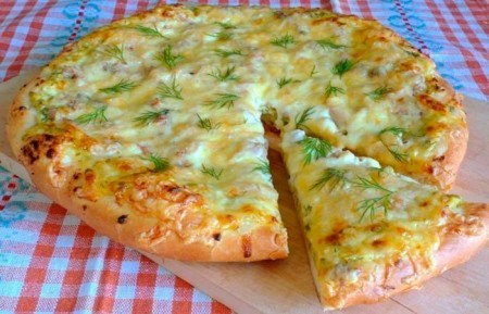 - Готовое тесто для пиццы разделить на 2 равные части. Каждую часть раскатать лепешкой толщиной 1 см. Выложить лепешки на противень застеленный пергаментной бумагой (если 2 сразу лепешки не поместятся, то выпекать придется 2 раза). Посыпать каждую лепешку небольшим количеством манки и выложить наверх творог с зеленью. Далее уложить куриное филе, а сверху посыпать тертым сыром.