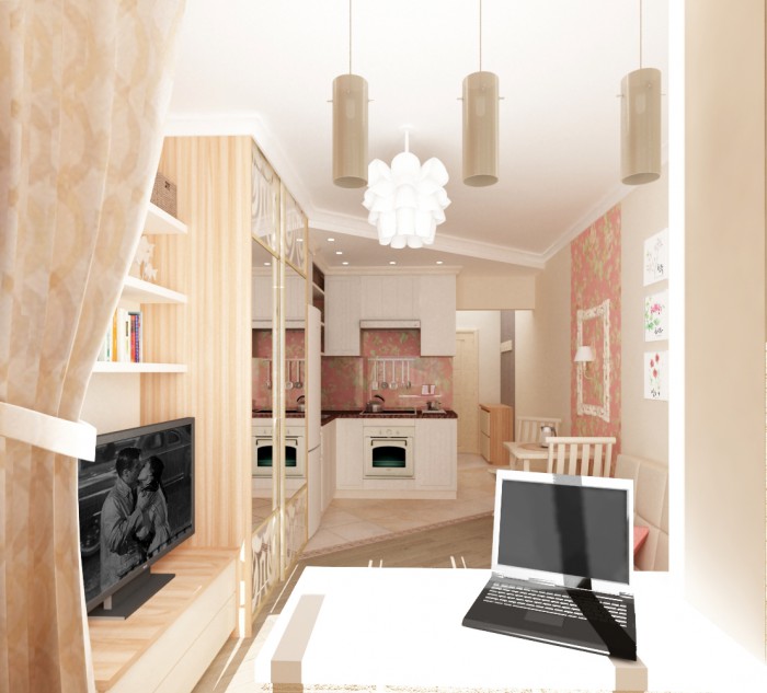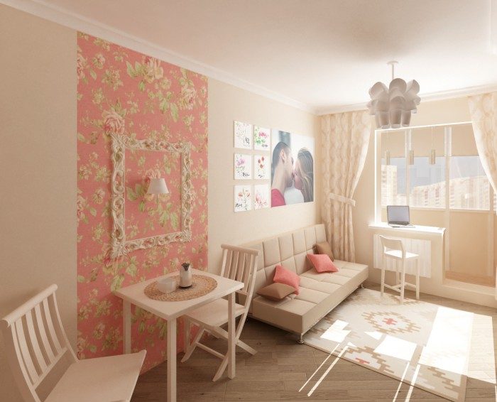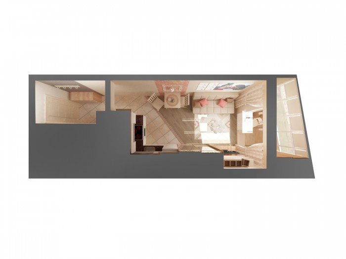 Квартира студия -25 м.кв. для молодой пары. В процессе работы было решено присоединить балкон и разместить на нем рабочее место и дополнительное место для хранения.
