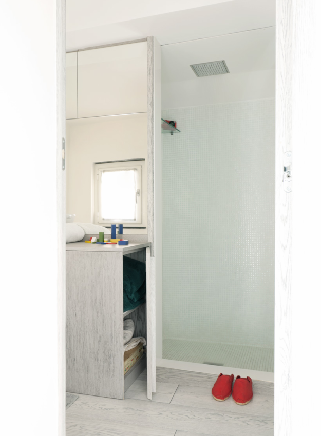 И не думайте, что при наличии целых трех комнат в 30-метровой квартире дизайнеры забыли о санузле. Полноценный туалет с душевой находится возле детской и представляет собой очень хорошо продуманное пространство, в планировке которого используется каждый сантиметр.