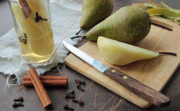 Чистые фрукты режем средними дольками. Кипятим воду, добавляем сахар, в сироп перекладываем груши. Доводим до кипения, варим до готовности, около 10 минут. За минуту до окончания варки добавляем мяту и выключаем огонь. Добавляем сок лимона и оставляем настаиваться несколько часов.