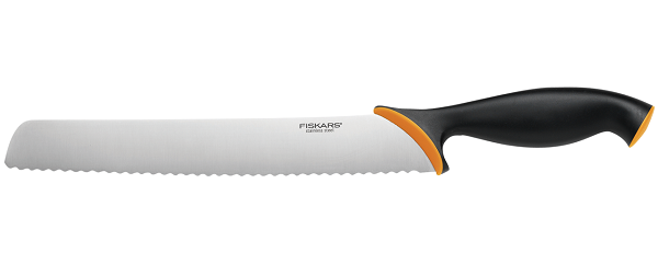 Один из тех ножей, про которые обычно говорят «я им никогда не пользуюсь». В идеале должен отлично разрезать хлебную корочку, не приминая сам хлеб, но и не рвать мякоть. Нож для хлеба — длинный с прямым и очень острым клинком. В отличие от большинства ножей, он заканчивается не острием, а плавным скруглением. Лезвие с крупными зубчиками нарежет идеальные кусочки без крошек.