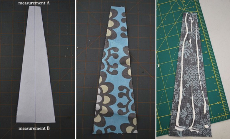 По этому же лекалу делаем заготовки из однотонной ткани. Их количество в два раза больше цветных клиньев, так как они двойные. Поэтому при раскрое оставляем припуски на боковые швы, сшиваем детали попарно по бокам, выворачиваем, отутюживаем.