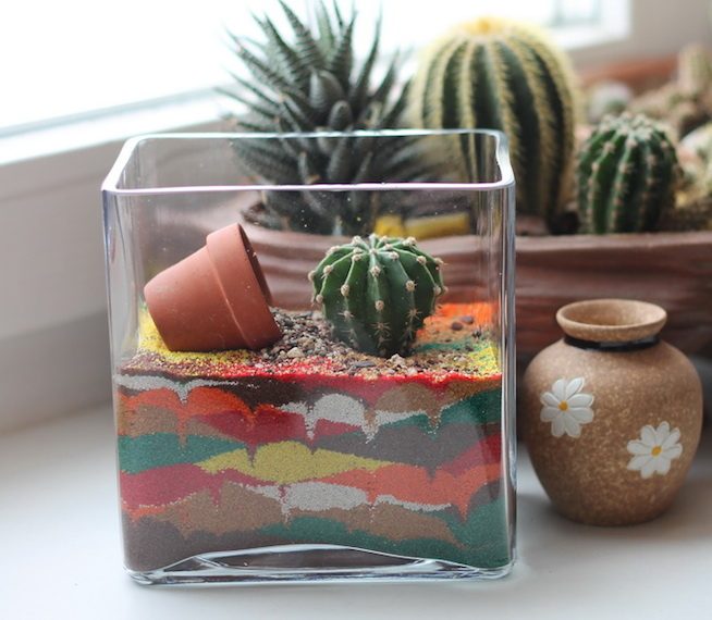 Специальный флористический песок продается в магазинах, и его использование помогает расширить границы стандартного высаживания растений. Дело в том, что помимо украшения верхних слоев грунта, он подходит для высаживания в него растений: к примеру, кактусов. Подберите открытую стеклянную вазу, засыпьте флористическим песком контрастного цвета и посадите кактус. На свободной площади вы сможете выполнить любые рисунки и дополнить композицию.
