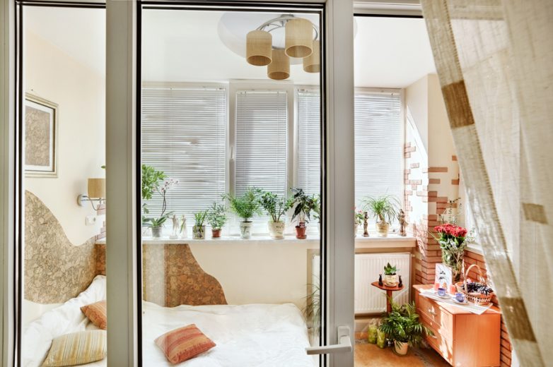 Объединение жилой комнаты с лоджией или балконом в блочных домах занимает второе место по популярности. В случае с лоджией есть ряд проблем. Так, согласно санитарным нормам и правилам, не разделять комнату и балконное помещение нельзя. Однако проблему можно решить, например, установкой витражей.