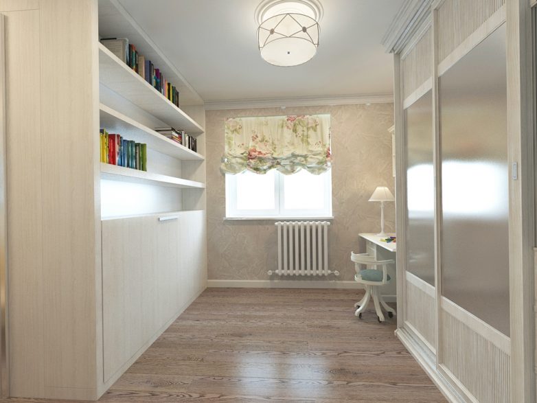 Чтобы в комнате было необходимое для работы и отдыха, дизайнер использовала трансформирующую мебель. Так, например, кровать родителей превращается в компактный диван. Детская кровать убирается в шкаф простым движением, справится даже ребенок. Полноценную кровать сложно разместить на небольшой площади, в таком случае откидные кровати отличное решение. Столик для ноутбука также легко убирается при необходимости. Местом для хранения вещей выбран шкаф-купе с секцией для комода и зеркалом.