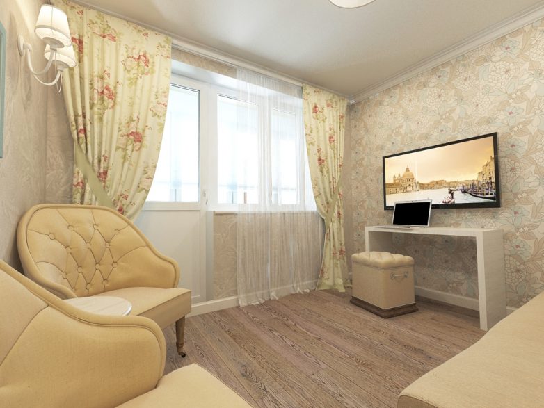 Отделка стен — декоративная штукатурка. “Цвет нейтральный, для небольшой площади сильные контрасты нежелательны” — советует дизайнер. В зоне спальни-гостиной стена с акцентом — отделана обоями. На полу паркетная доска красивого карамельного цвета. Окна в зоне спальни оформлены легкой вуалью и портьерами с цветочным рисунком.