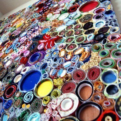 Ее картины похожи на поляны цветов, только сделаны из скрученной бумаги с сердцевиной из ткани, фольги, проволоки, поролона, бисера, картона, краски. Одним словом, подручный металлический, пластиковый и прочий хлам, который уже давно должен быть выкинут или остался от предыдущих работ.
