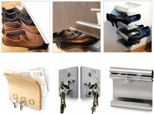 Минимализм, строгость и в тоже время изящество декоративной обработки вешалок, обувниц и прочих аксессуаров делают весьма желанными в доме, где хозяева выбрали за основу минимализм или стиль HiTech.