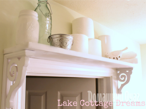В совмещенном санузле обычно пустует пространство над унитазом, там можно повесить несколько одинаковых полок. Оригинальная идея — поставить крепления полок не снизу, а по бокам полок, превратив их в элемент декора. Для этого подойдут деревянные резные крепления. Чтобы повесить такие полки, прикрутите металлические крепежи к задней стенке полки. Для красоты можно покрасить полку и крепления в белый цвет или в цвет кафеля.