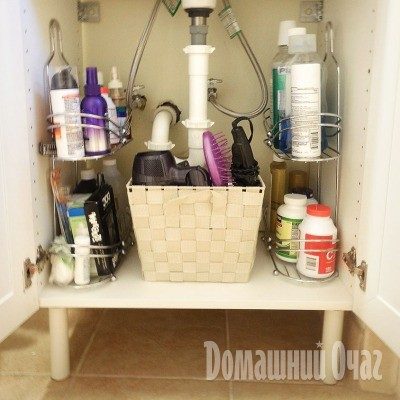 Если под раковиной просторный двустворчатый шкаф, повесьте внутри несколько ящичков — органайзеров, а на дверки прикрепите металлические полки для хранения моющих средств и фена.
