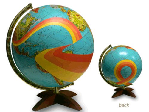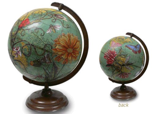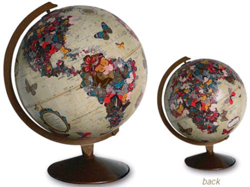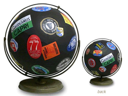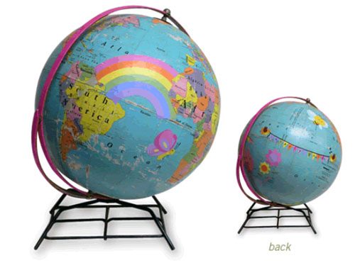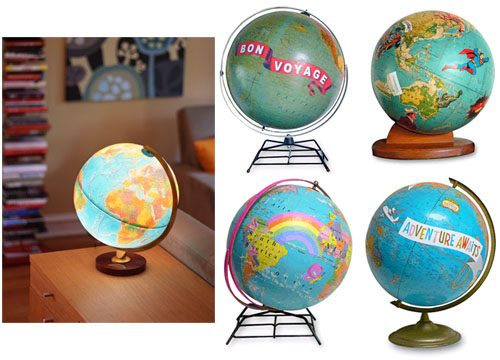 Еще одной отличной идей будет собственноручно декорировать глобус, наклеив на него интересные наклейки, вырезки из журналов или же расписав вручную. А, чтобы убедиться, что это действительно хорошая идея, я предлагаю Вам взглянуть на несколько фотографий подобных декорированных глобусов, которые, безусловно, будут творческим украшением любого интерьера.