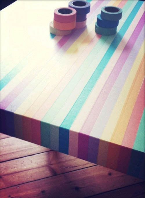 Сделайте свой мир ярче с помощью этих лент – оклейте по периметру столешницу цветными полосами, создав радужную, поднимающую настроение картину. Эта идея будет хорошим творческим решением, как для обеденного стола, так и для необычного яркого столика в детской комнате. Вы можете легко изменить внешний вид стола любого размера, использовать для этого любые цвета, какие Вы предпочитаете. Согласитесь, это, пожалуй, самая простая и яркая hand made идея по оформлению Вашей мебели!
