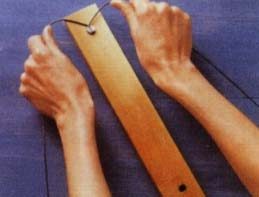 4. Отвинтите шуруп, снимите с него сердечко и вновь ввинтите на место. Отметьте с обеих сторон от кончика сердечка отрезки длиной 6 см. В отмеченных точках обери иге каждую проволоку одним витком вокруг шурупа и согните ее конец под прямым углом.