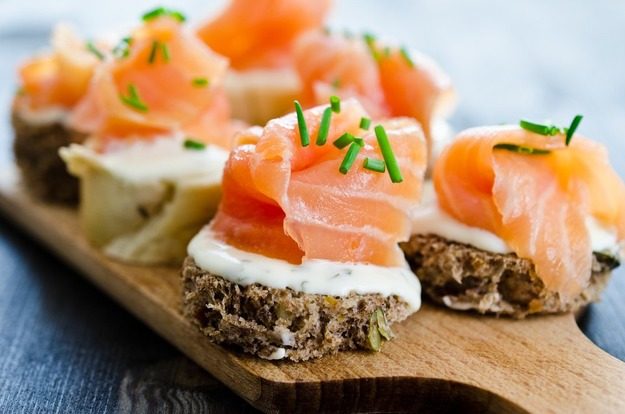 Семга ничуть не уступает сыру по популярности. Эта рыба используется для приготовления более праздничных вариантов закусок. Из семги получаются очень вкусные и интересные канапе. А смотрятся они и без дополнительных украшений красиво. Стоит добавить в канапе из семги и сливочный сыр. За основу берите ржаной хлеб. Вместе эти продукты сочетаются восхитительно. А сверху такую канапешку можно украсить веточкой зелени.