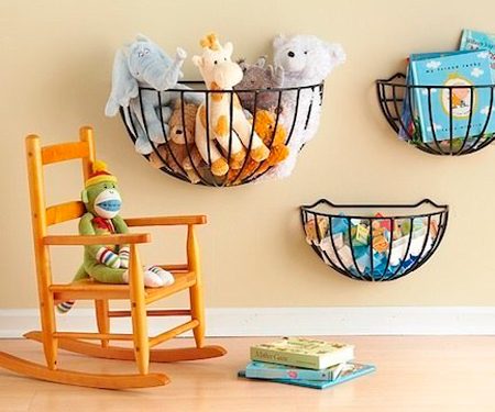 Если у вас мало места для хранения, возможно, вы нерационально используете пространство. Металлические корзины-кашпо, которых немало в магазинах «все для сада», станут прекрасными корзинами для игрушек. Нужно просто закрепить их на небольшой высоте, чтобы ребенку было удобно, и складывать туда что попало: все будет видно и ничто не потеряется.