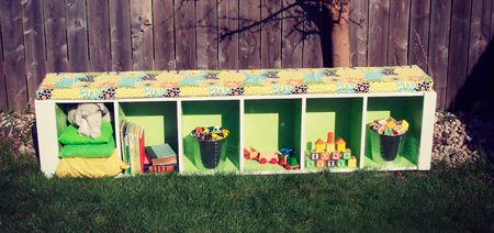Перекрашенный и снабженный ярким матрасиком кухонный пенал превратится в детскую садовую скамейку: никто даже не заподозрит, что у этого предмета обихода когда-то была другая жизнь. В отделениях-бывших полках можно хранить книжки и игрушки, а на самой скамейке – сидеть или лежать.