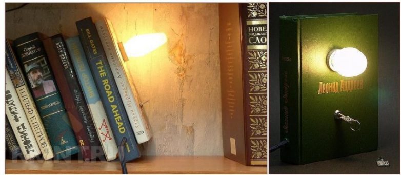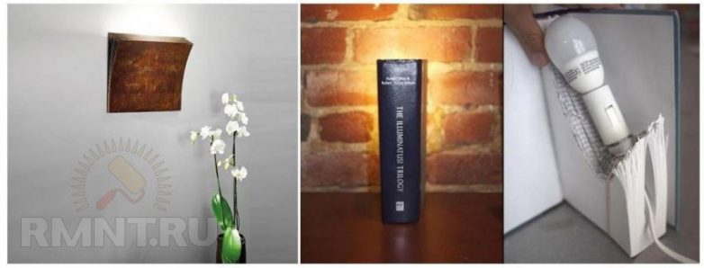 Чтобы сделать самый простой светильник, вам хватит всего несколько старых книг — прорезав внутри томов полость под размещение электроарматуры и просверлив отверстие для шнура, закрепите в книге лампочку красивой формы и выведите переключающий тумблер.