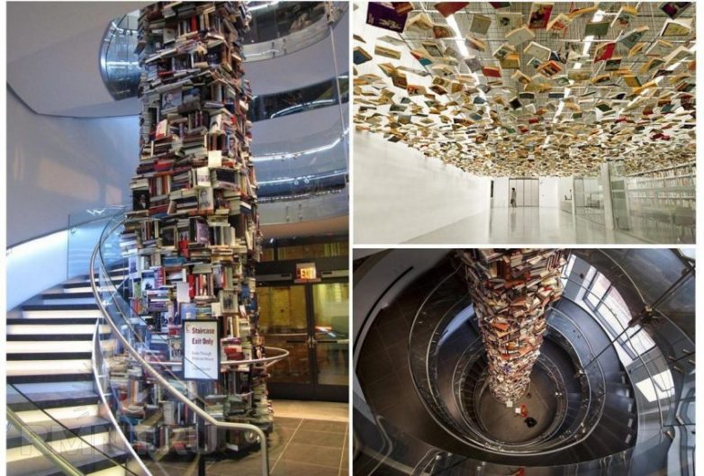 Уличная инсталляция из книг — вещь необычная и, к тому же, сезонная. Однако книжная колонна должна обязательно понравиться любителям чтения — ее можно воздвигнуть на фундаменте из камней посреди водоема или установить для поддержки поникших ветвей в саду