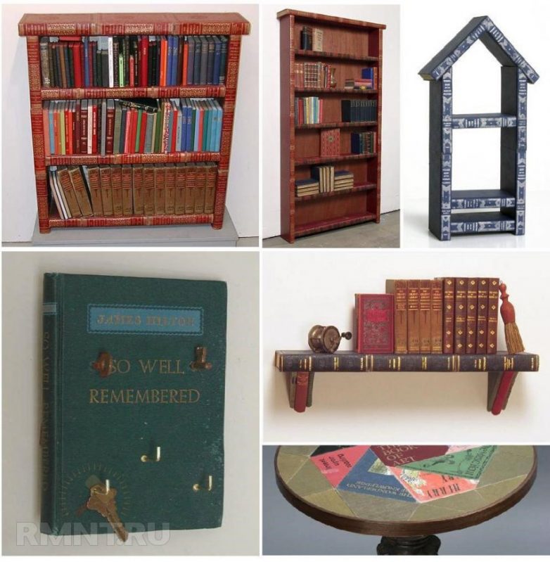 Из обветшалых книг получаются не только удобные полки, но и столы оригинальной конструкции. Основания, столешницы, ножки — буквально все детали мебели могут быть собраны из книжных томов.