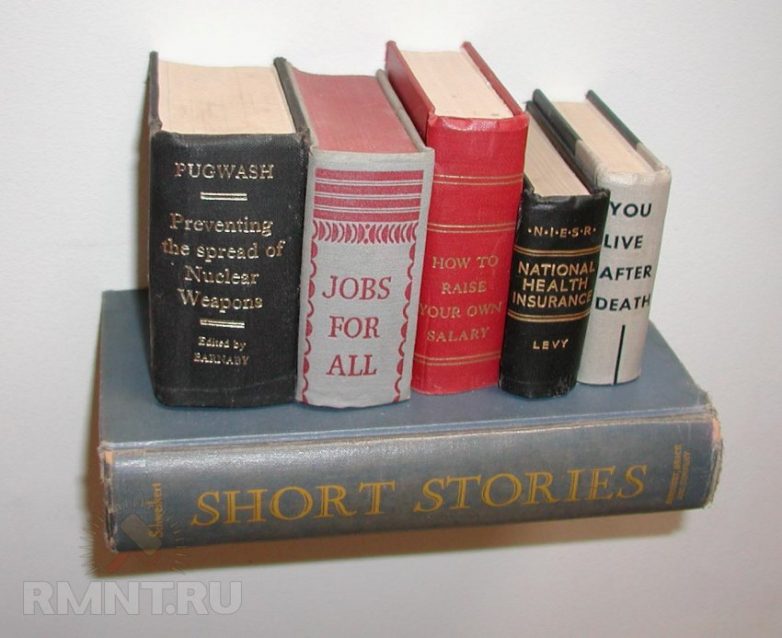 Полка из старых книг пирамидальной конфигурации в исполнении значительно проще, чем линейной — здесь не нужно тратить усилия на подбор абсолютно одинаковых по толщине томиков, а затем долго их подгонять. Крепежные детали — уголки или кронштейны, поддерживающие конструкцию, декорируются все теми же книгами, вырезанными по форме треугольника.