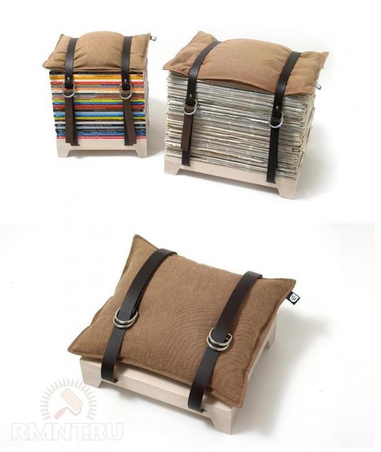 Дизайнеры NJU Studio предложили идею создания табуретов и оттоманок из старых журналов, книг и газет, которая придется весьма кстати при зонировании небольших помещений. Деревянная база, стопка макулатуры, подушка и кожаные ремни, которые позволяют регулировать высоту сидения — это рациональное решение для организации места хранения детских книг, записных книжек и бумаги.