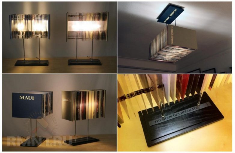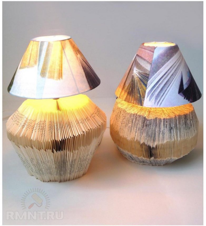 Создайте для своего домашнего интерьера композицию из книг разного формата, склеив их листы попарно — такие «гармошки» отлично выполнят миссию плафона для осветительного прибора — как настенного, так и настольного. Нестандартный вариант размещения подобного светильника — крепление в развернутом виде на угол.