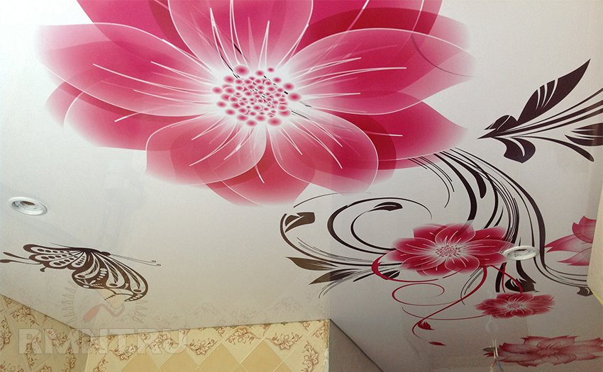 Сейчас появилось интересное предложение для тех, кто желает «тюнинговать» свой уже установленный натяжной потолок. Это различные наклейки 3D, также выполненные по технологии струйной печати.