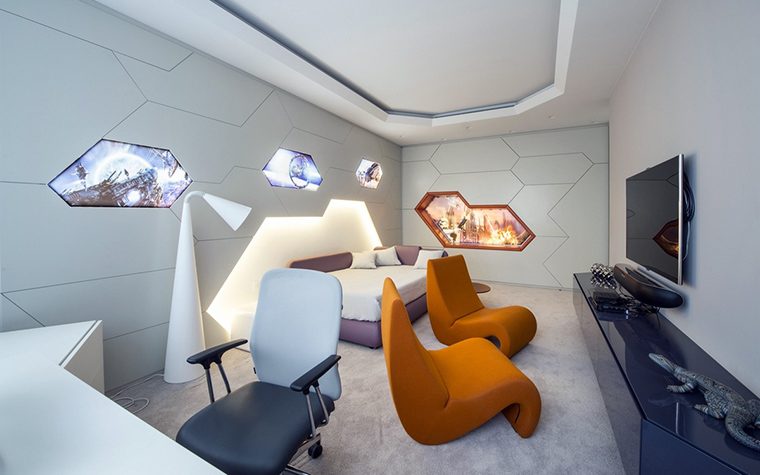 Детская комната оформлена эффектно и оригинально. Дизайнеры придумали интерьер в модном стиле футур с дизайнерской мебелью, яркими цветами и световыми нишами. Пол застелили мягким светло-серым ковролином в цвет стен. Пара забавных оранжевых кресел, похожих на автомобильные, особенно выигрышно смотрятся на сером ковролине.