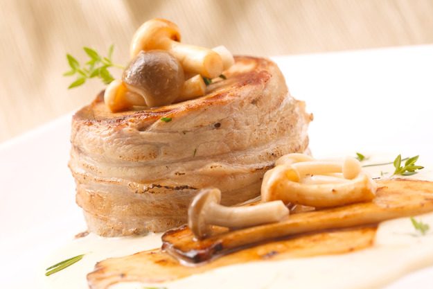Блюдо готово! Полейте тарелку соусом и выложите на нее медальоны. Украсить можно опятами и зернами горчицы.