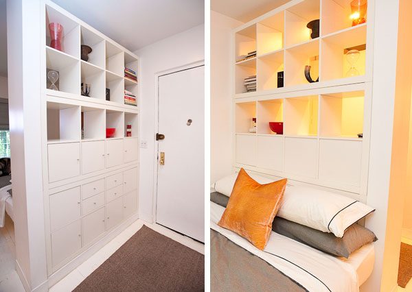 В маленьких квартирах в качестве перегородок чаще всего используются предметы мебели и интерьера — воздвигать дополнительную стену, чтобы поделить комнату надвое имеет смысл, только если в ней имеется два окна, иначе помещение будет слишком темным.