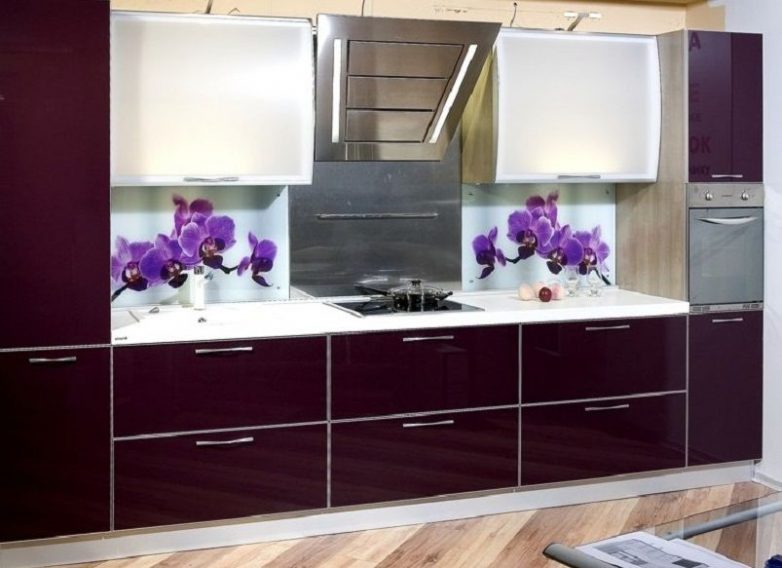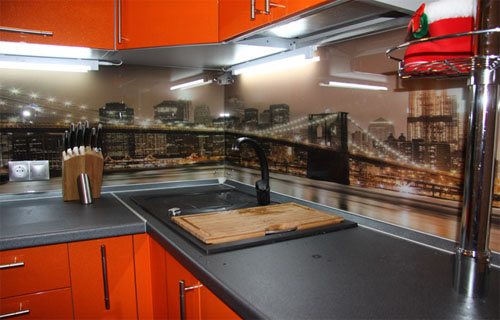 Этот отделочный материал представляет собой панель, изготовленную из ударопрочного стекла с нанесенным на нее рисунком или фотографией. Оформлять стеклянным панно (скинали) можно не только свободную часть стены кухни, но и фасад кухонного гарнитура – выглядит это очень необычно, стильно, а главное – эксклюзивно.