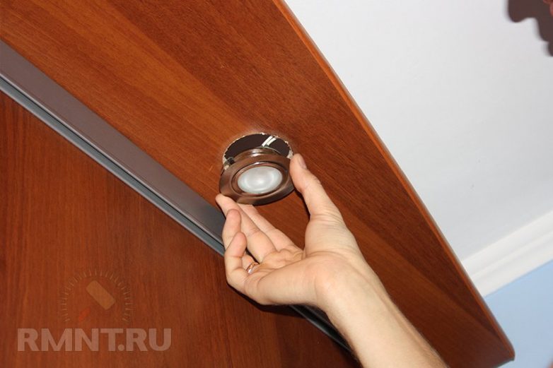 Устанавливаем галогенные светильники в отверстия в верхней крышке шкафа.