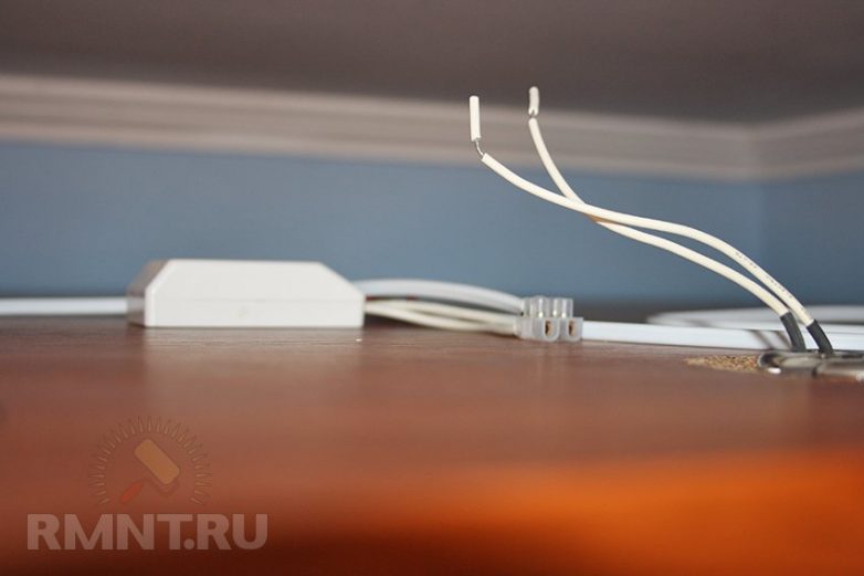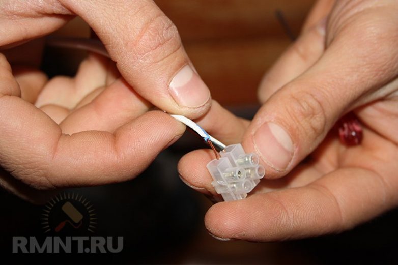 Закрепляем клеммник на проводе 220 В, заранее заложенном в стене для подключения подсветки шкафа. Для этого обязательно снимаем питание с провода!